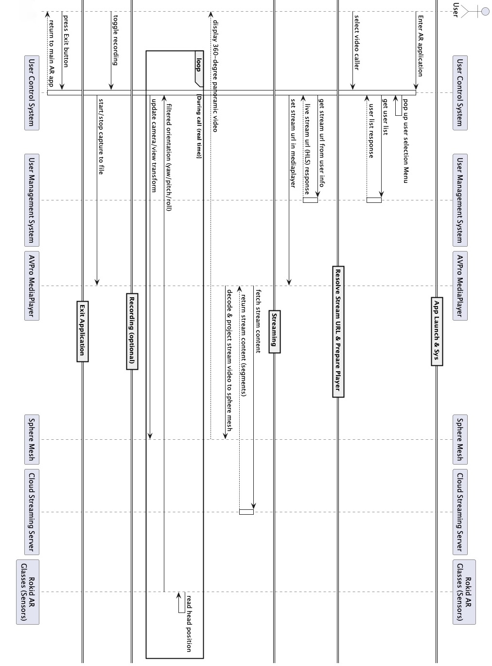The system follows a modular capture → cloud distribution → playback workflow: an Insta360 X2 captures the scene and pushes the stream to the cloud, a cloud streaming platform transcodes/distributes it, and a Unity-based AR calling app renders the live panorama on Rokid with head-tracked viewing.